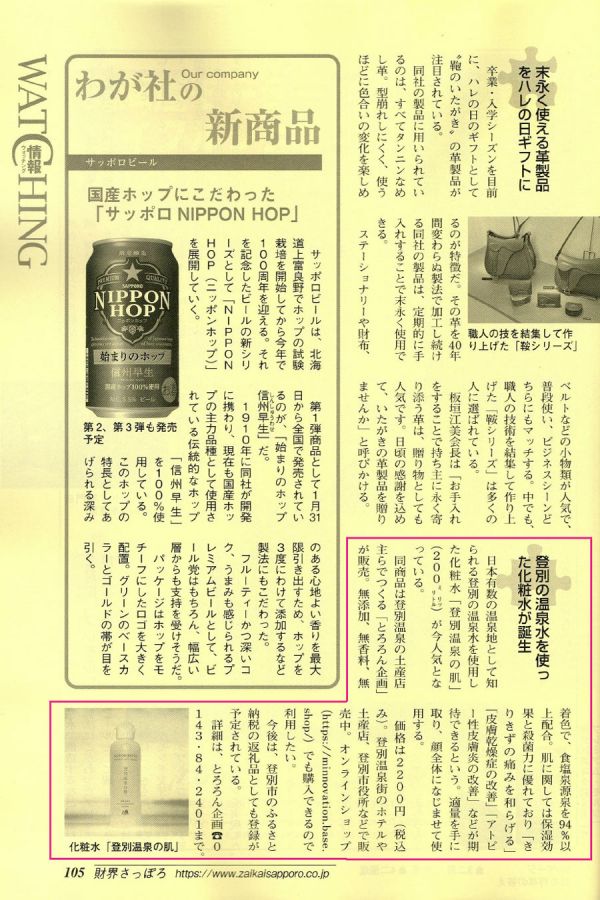 財界さっぽろ3月号にて 化粧水「登別温泉の肌」紹介して頂きました。